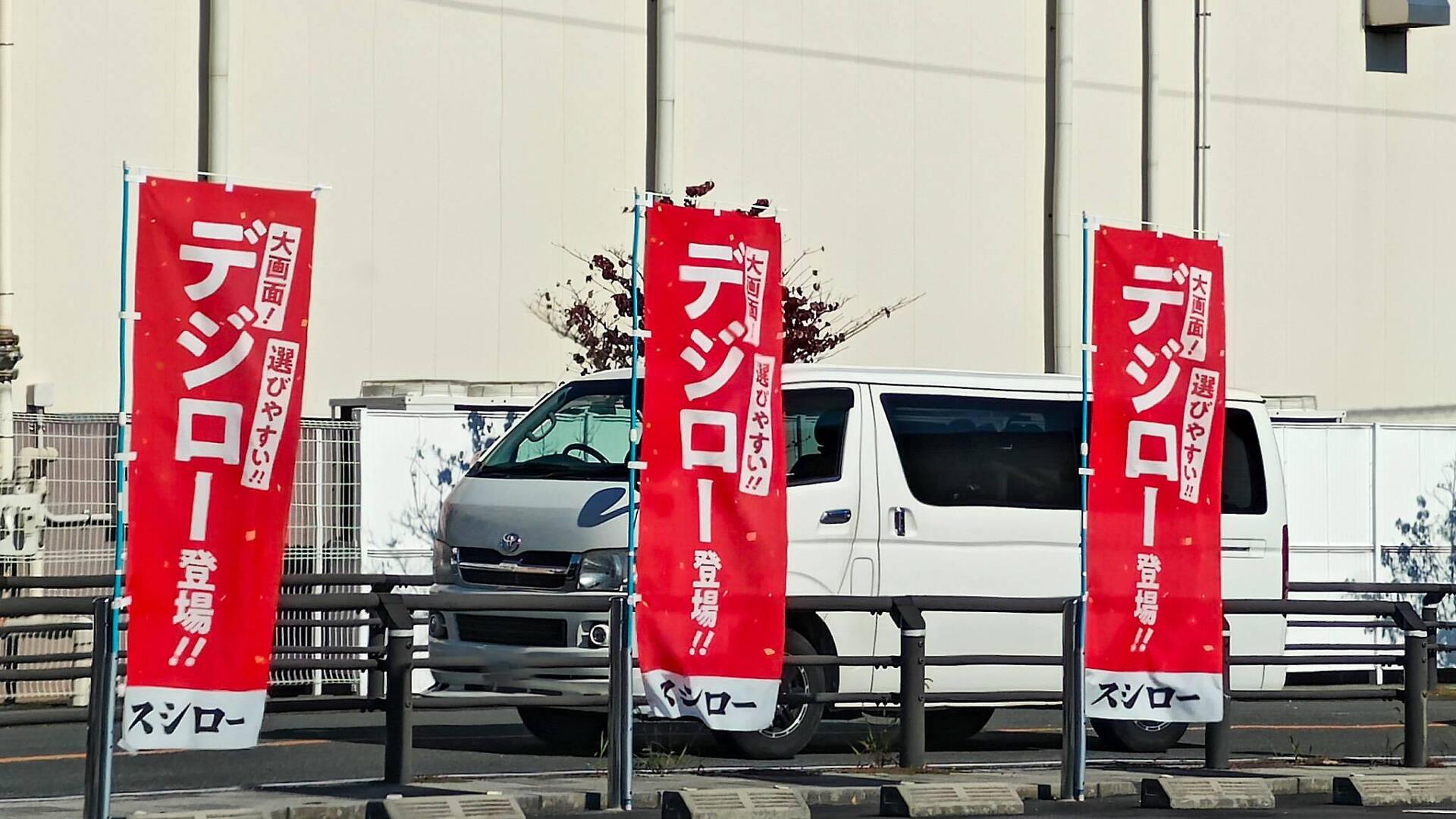駐車場に掲げられた「デジロー」専用のぼりが、対応店舗の目印になっています。